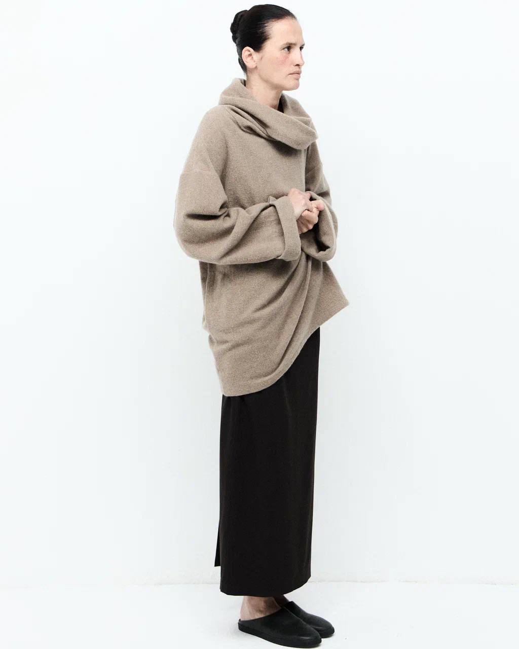 Кашемировый свитер "Helga" вдохновлен свитером мамы основательницы бренда и переосмыслен в рамках коллекции "TUN". Модель оверсайз с уютным хомутом идеально подходит для создания многослойных образов: его можно носить как самостоятельное мини-платье или сочетать с брюками и юбками, подчеркивая индивидуальный стиль.