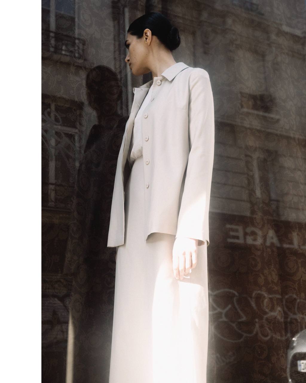 Рубашка из высококачественной натуральной шерсти фабрики Drago в Тальяне, нежностью напоминающей шёлк. Рубашка с застёжкой-липучкой стилизована под юбку Ирен из той же ткани. Чистый минимализм и безупречный дизайн, который также может служить дополнительным слоем одежды.