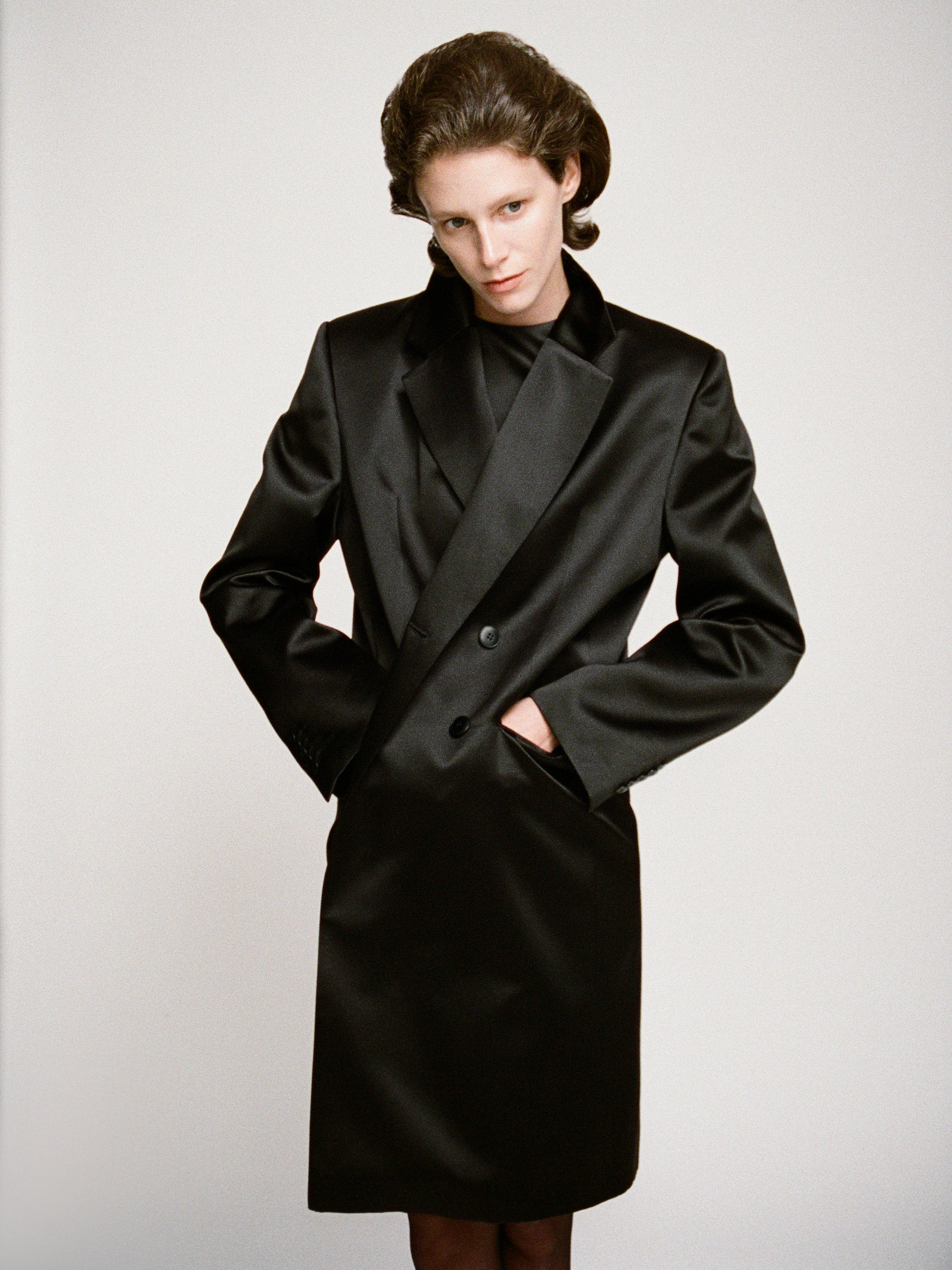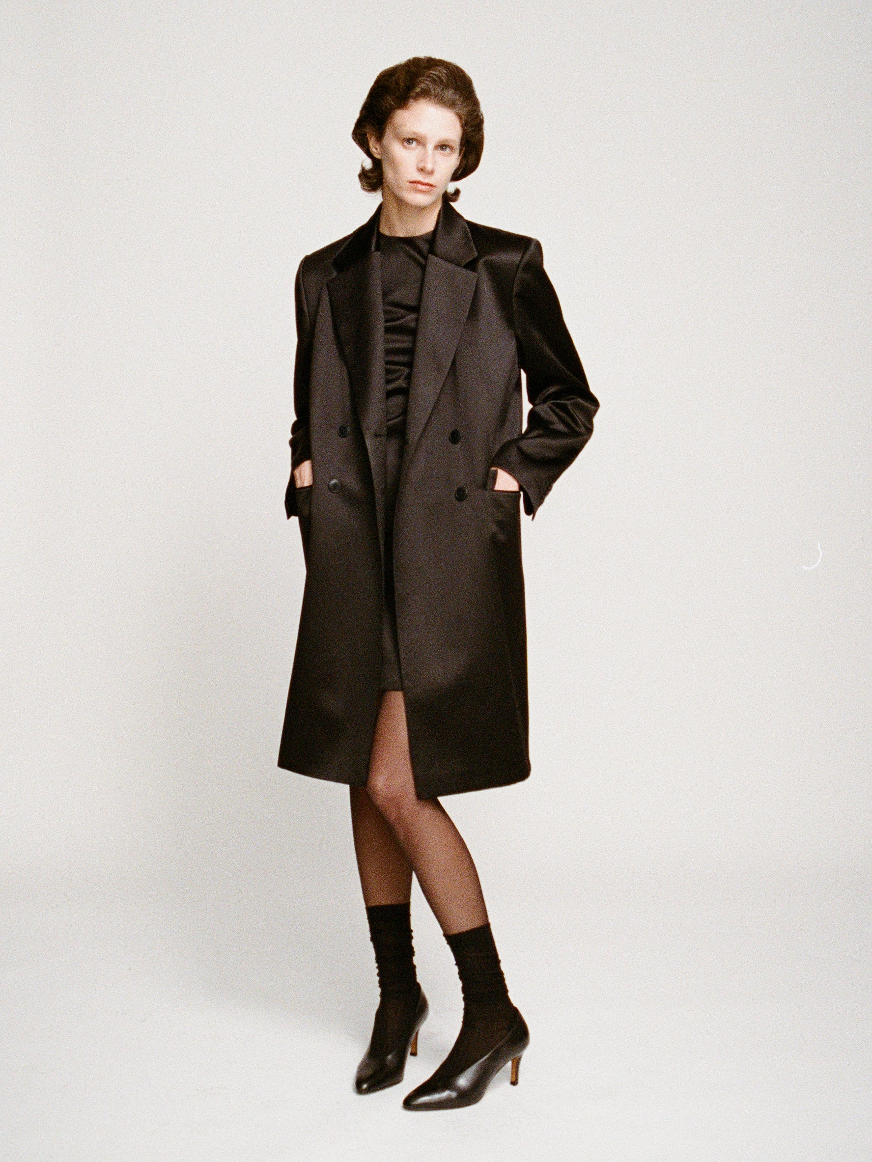 Удлиненный жакет из плотного атласного шелка станет уникальным атрибутом вашего гардероба. Жакет дополнен двубортной застежкой и боковыми карманами.