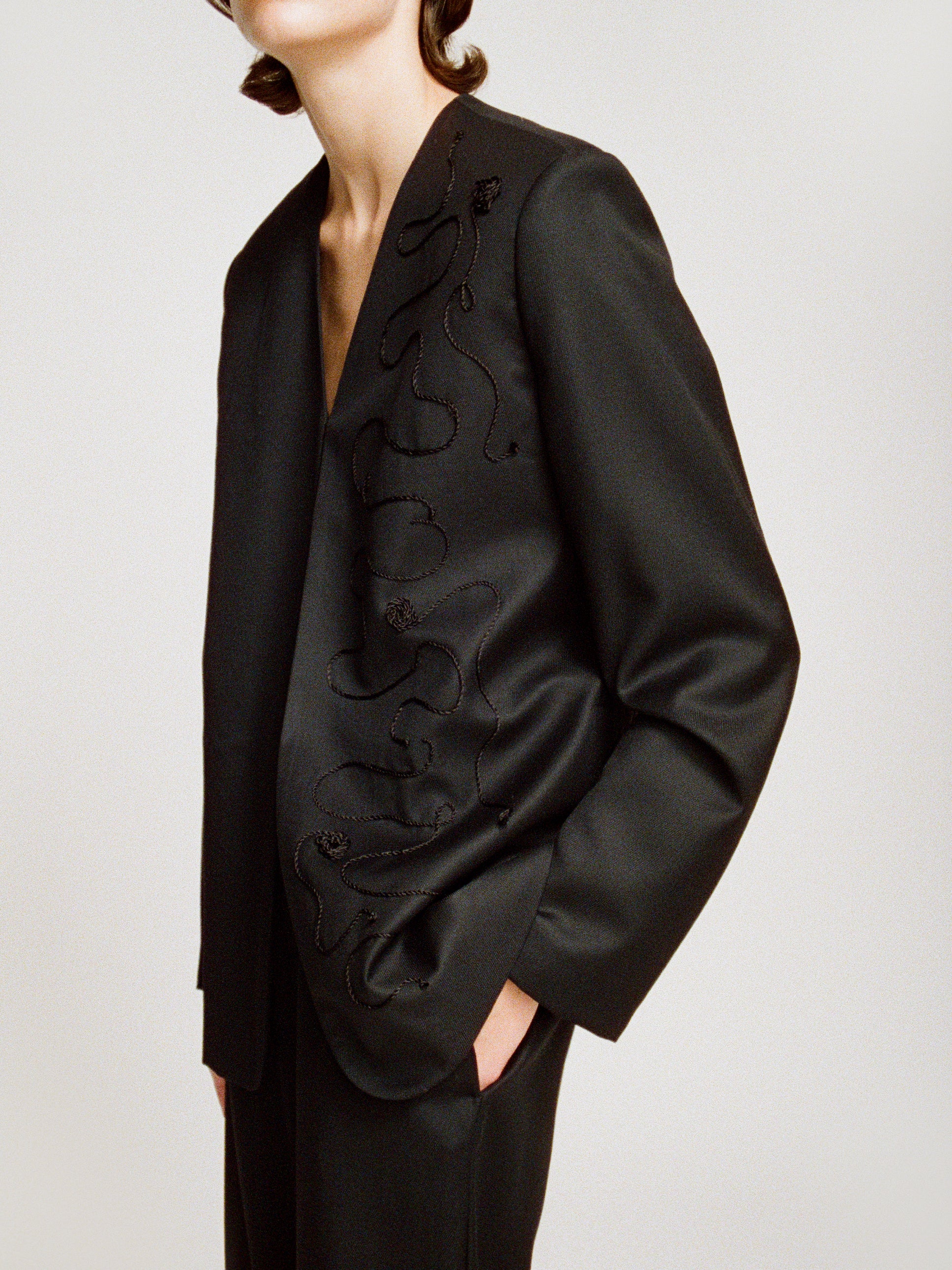 Архивная модель пиджака без лацканов из новой ткани — 100% натуральная шерсть. В лучшем проявлении вневременной эстетики.